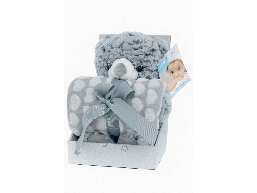 Darčekový set osahuje: hebká detská deka + plyšová hračka sivý medvedík.